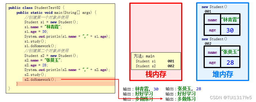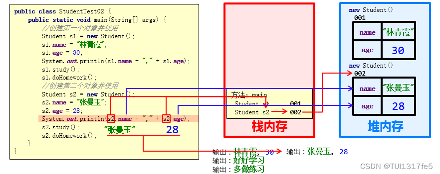 public class StudentDemo { public static void main(String[] args) { Student s1 = new Student(); s1.setName("林青霞"); s1.setAge(30); s1.show();