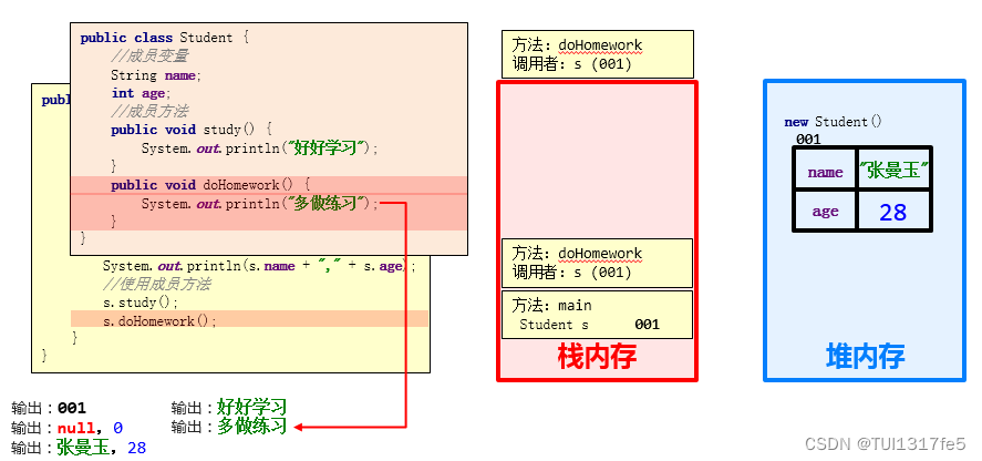 - 行为:在类中通过成员方法来体现(和前面的方法相比去掉static关键字即可)