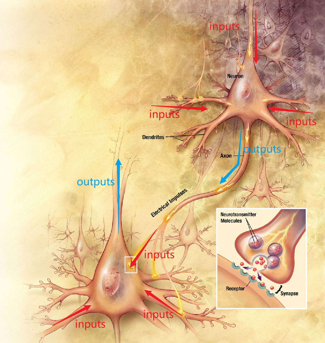 大脑中的神经元接受许多输入的信息,并进行一些计算和处理,计算后通过电脉冲发送给其他的神经元。上层神经元的输出又成为下层神经元的输入,下层神经元再次聚合来自其他神经元的输出作为该神经元的输入,然后将自己的输出发到其他神经元。这便是大脑中神经网络的工作原理。