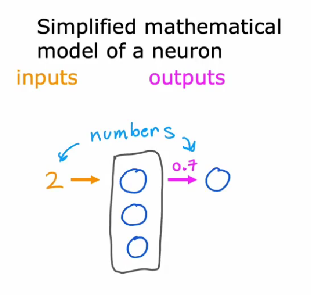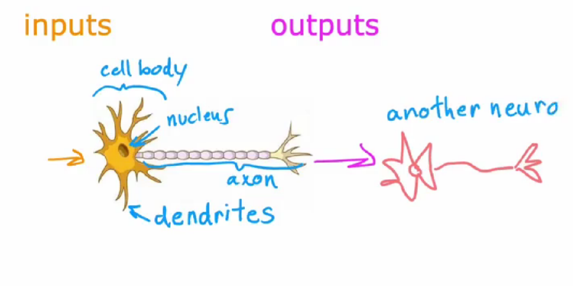 每一个生物神经元都可以被认为是一个处理单元/神经核(processing unit/Nucleus),它含有许多输入/树突(input/Dendrite),并且有一个输出/轴突(output/Axon)。生物神经元会发送电脉冲,成为另一个神经元的输入。神经网络是大量神经元相互链接并通过电脉冲来交流的一个网络。
