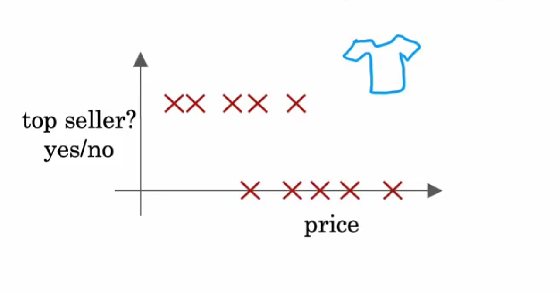在此示例中,输入特征X是短袖的价格,如果应用逻辑回归sigmoid函数来拟合这些数据,那么预测输出则为$\frac1{1+e^{-(wx+b)}}$