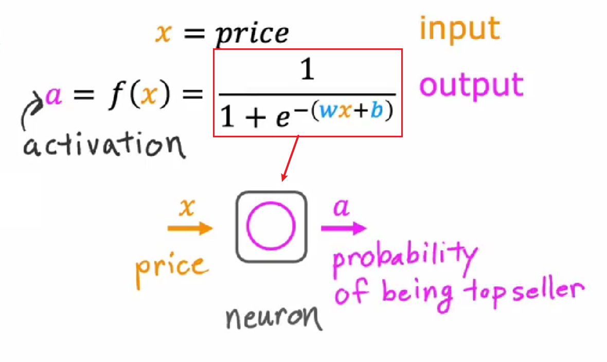 这个逻辑回归单元可看作大脑中单个神经元非常简化的数学模型。这个人工神经元所要做的就是,将价格X输入,然后利用sigmoid函数公式 $\frac1{1+e^{-(wx+b)}}$ 计算出输出值a,输出的则为这件短袖可能成为畅销品的概率。