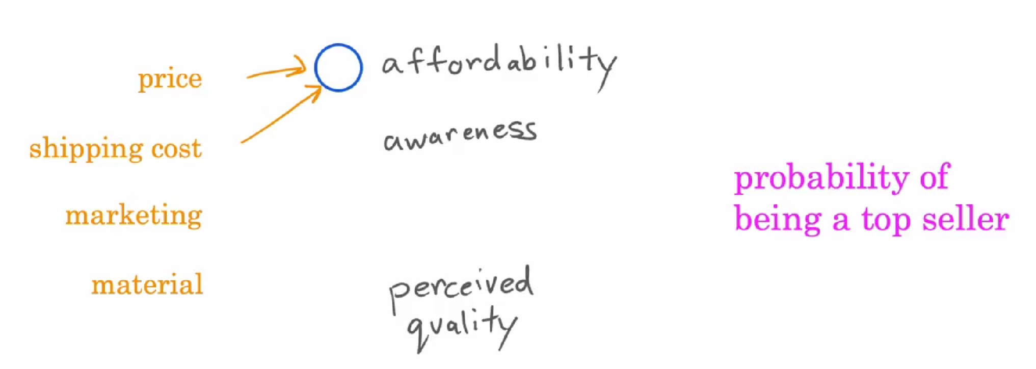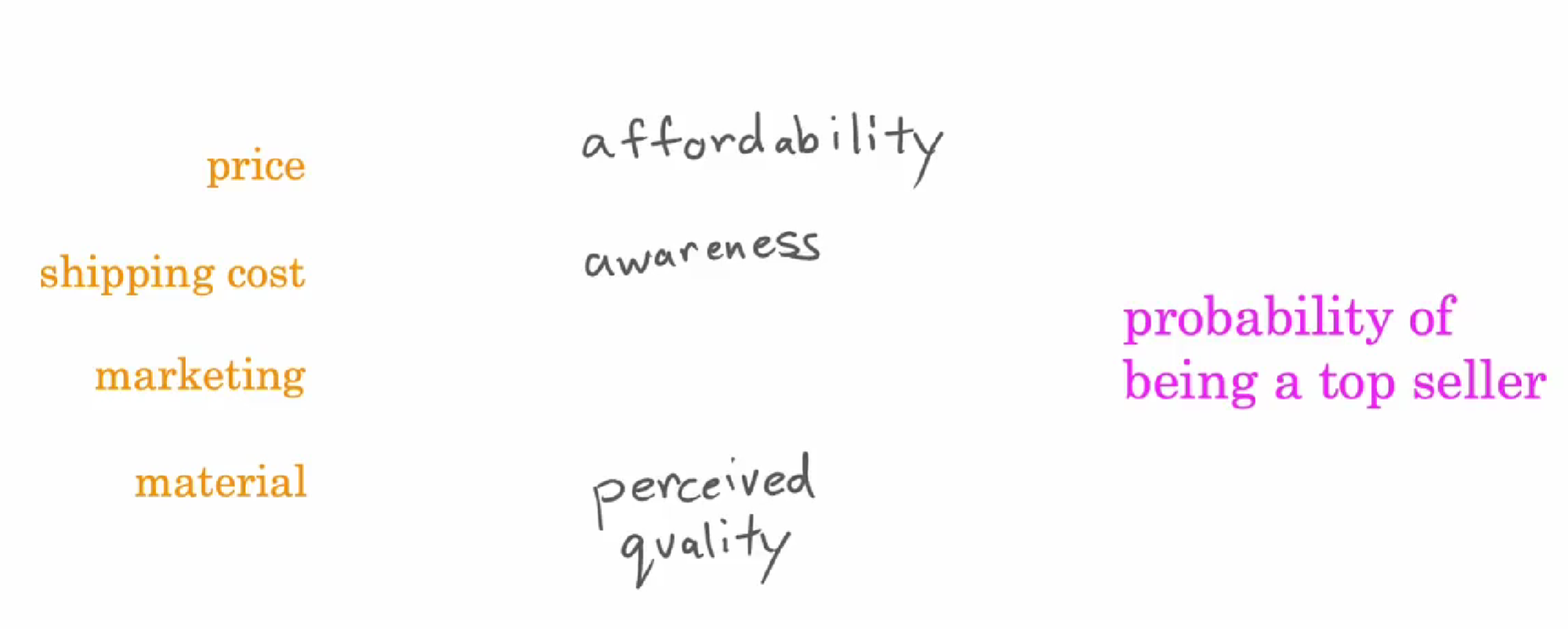 接下来我们看一个更复杂的需求预测案例,在该案例中我们用四个特征来预测短袖是否为畅销品。四个特征为价格(price)、运费(shipping cost)、营销手段(marketing)、材料质量(material)。我们假设短袖是否能成为畅销品取决于以下几个因素: