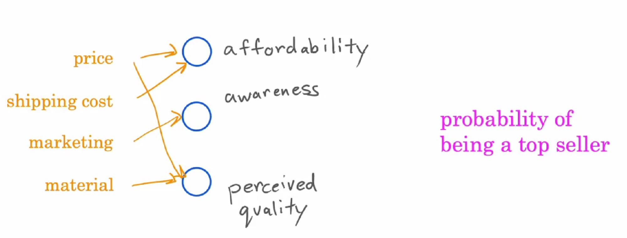 接着,创建一个人工神经元来预测潜在买家对这件T恤衫的认识程度。短袖知名程度归因于营销手段。最后,要创建另一个神经元来估计人们是否认为这是高质量的短袖。这可能是短袖价格和材料质量的函数。