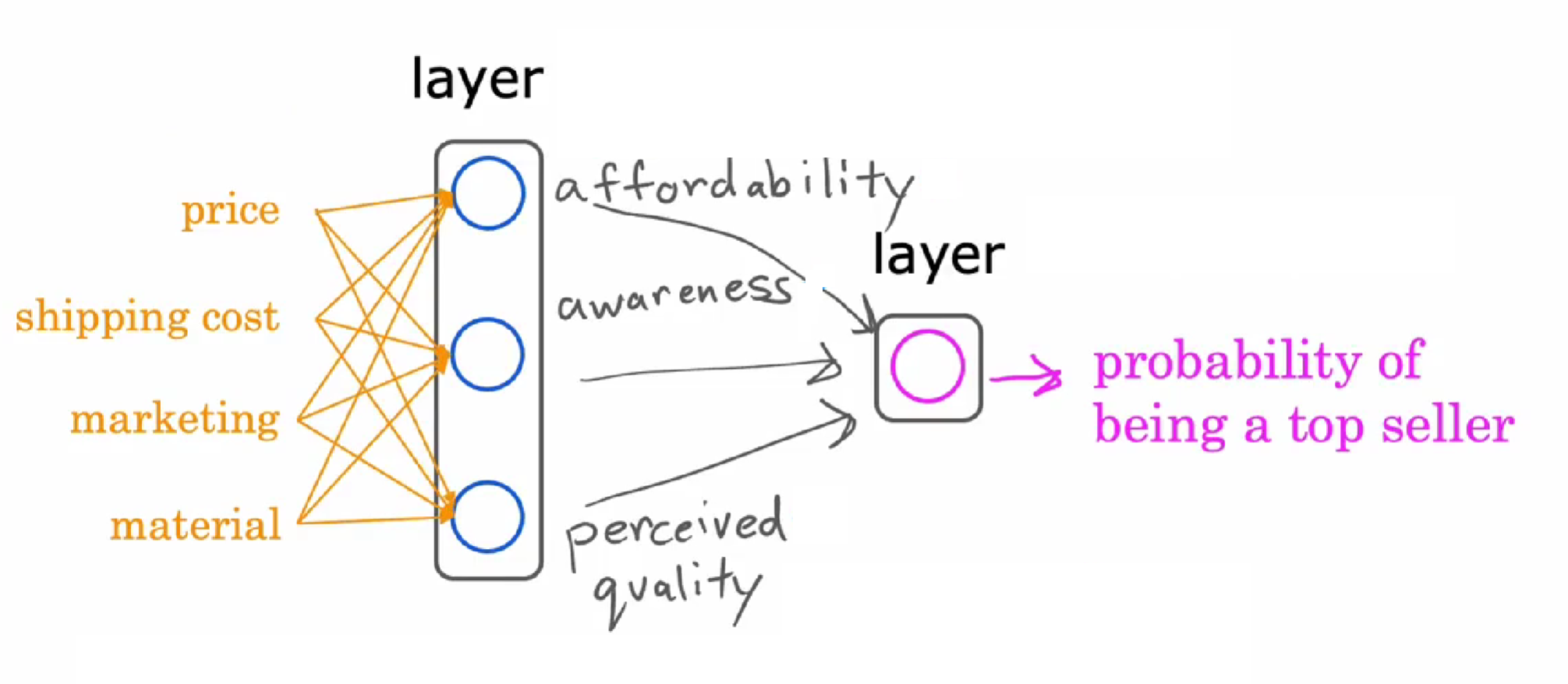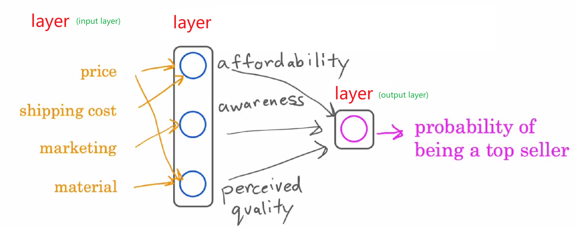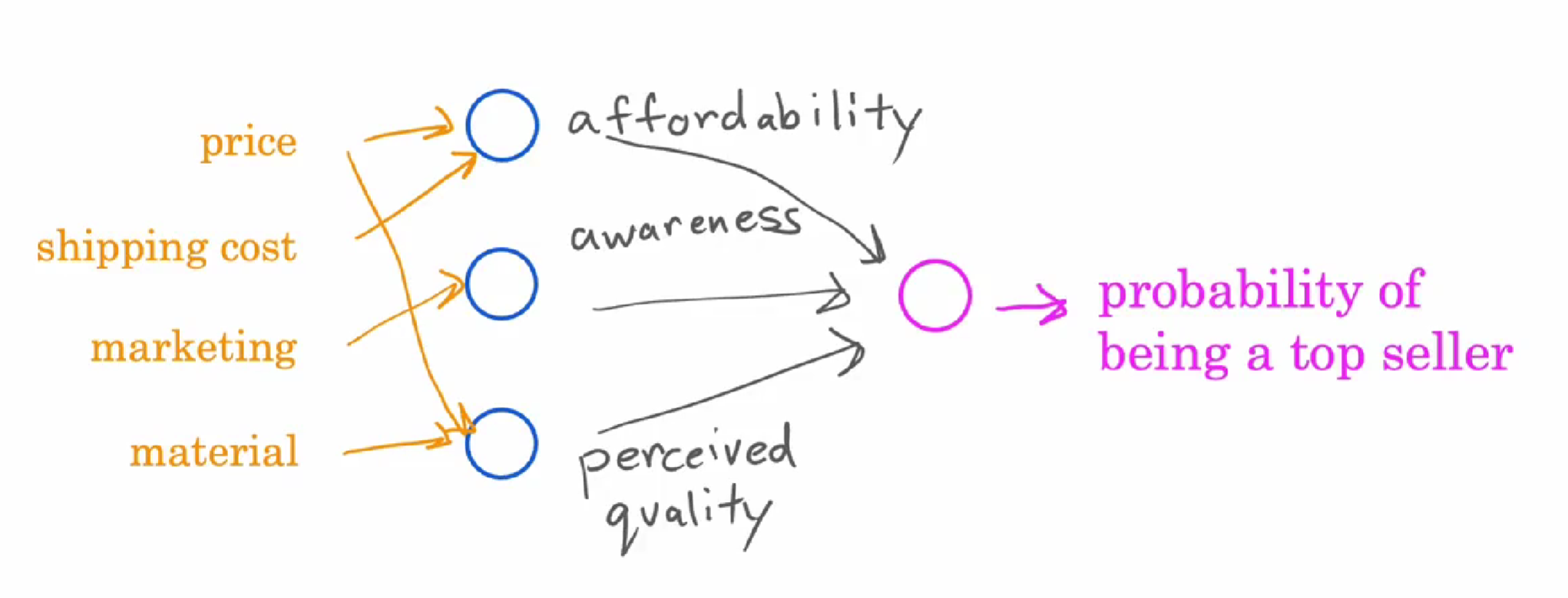 鉴于对可负担性(affordability)、认识程度(awareness)、感知质量(perceived quality)的预测,我们将这三个神经元的输出连接到右侧另一个神经元,然后该神经元输入这三个数字并输出可能成为畅销品的概率。