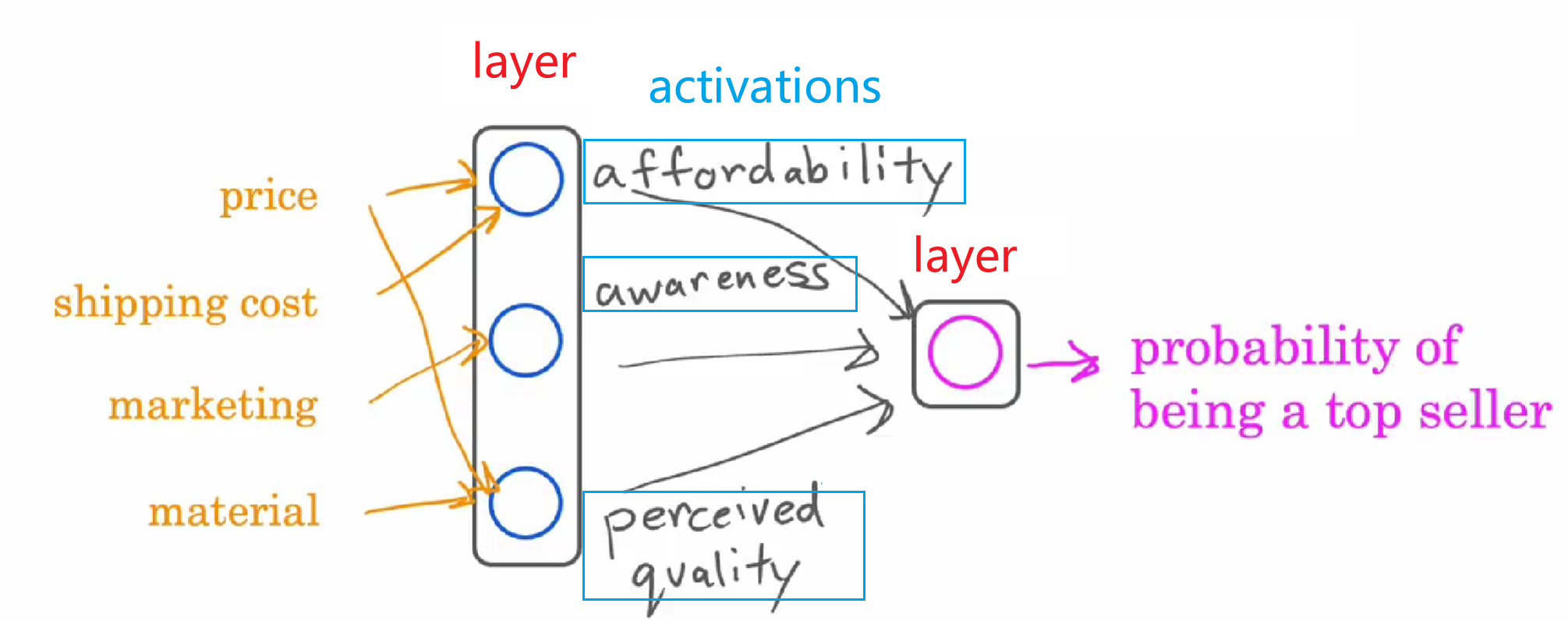 我们还将 affordability、awareness、perceived quality 叫做激活(activations)。激活源于生物神经元,它指的是生物神经元向下游其他神经元发送的高输出值或发送许多电脉冲的程度。这些关于affordability、awareness和perceived quality的数字是该层中这三个神经元的激活。同样输出概率是右侧这个神经元的激活。