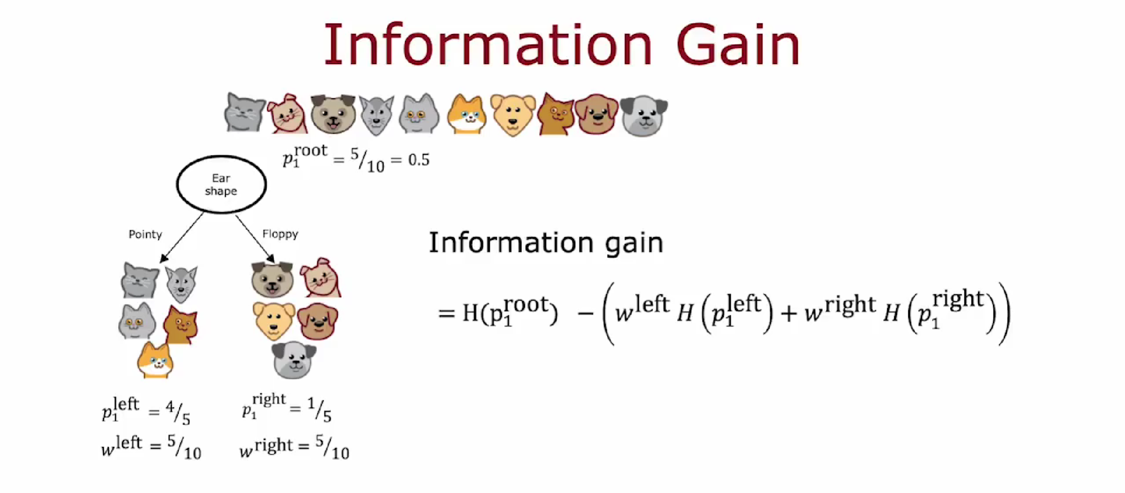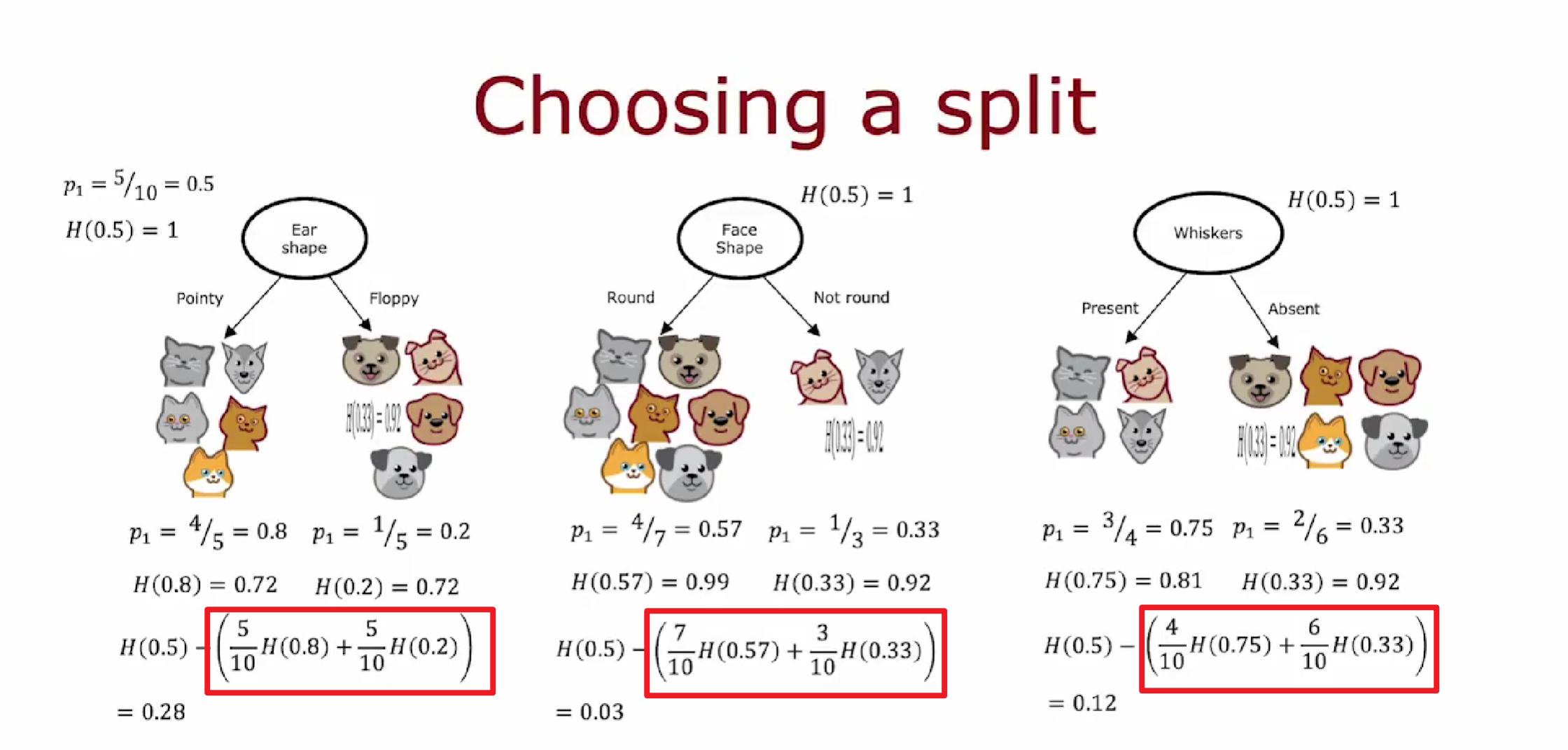 未分支前有5个猫,5个狗,因此初始熵熵 $H(0.5)=1$ 。