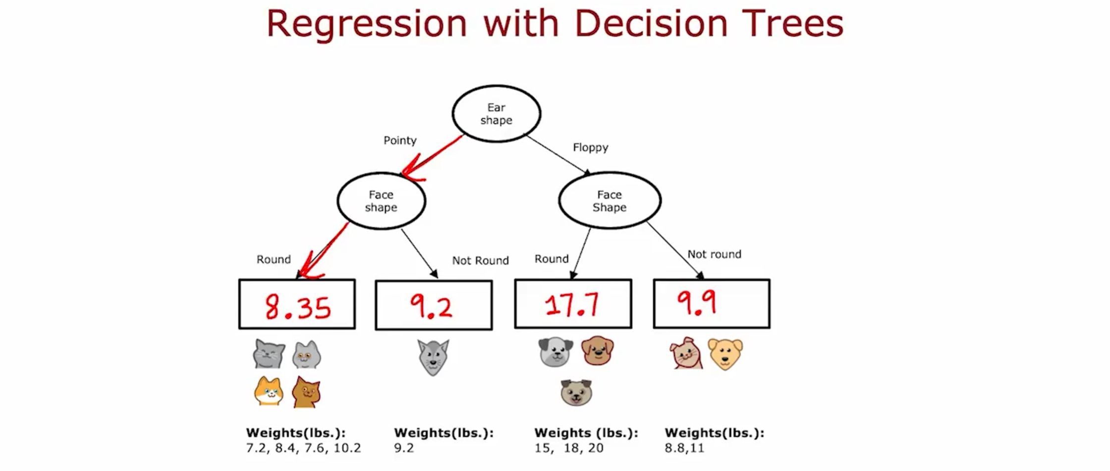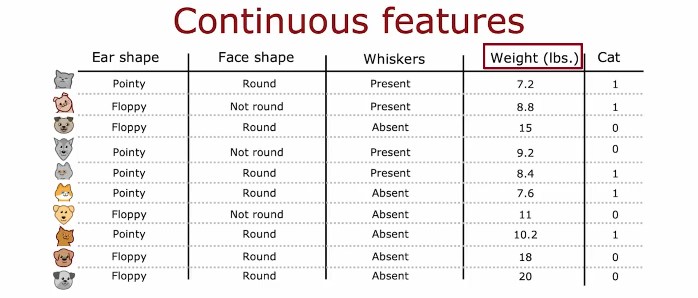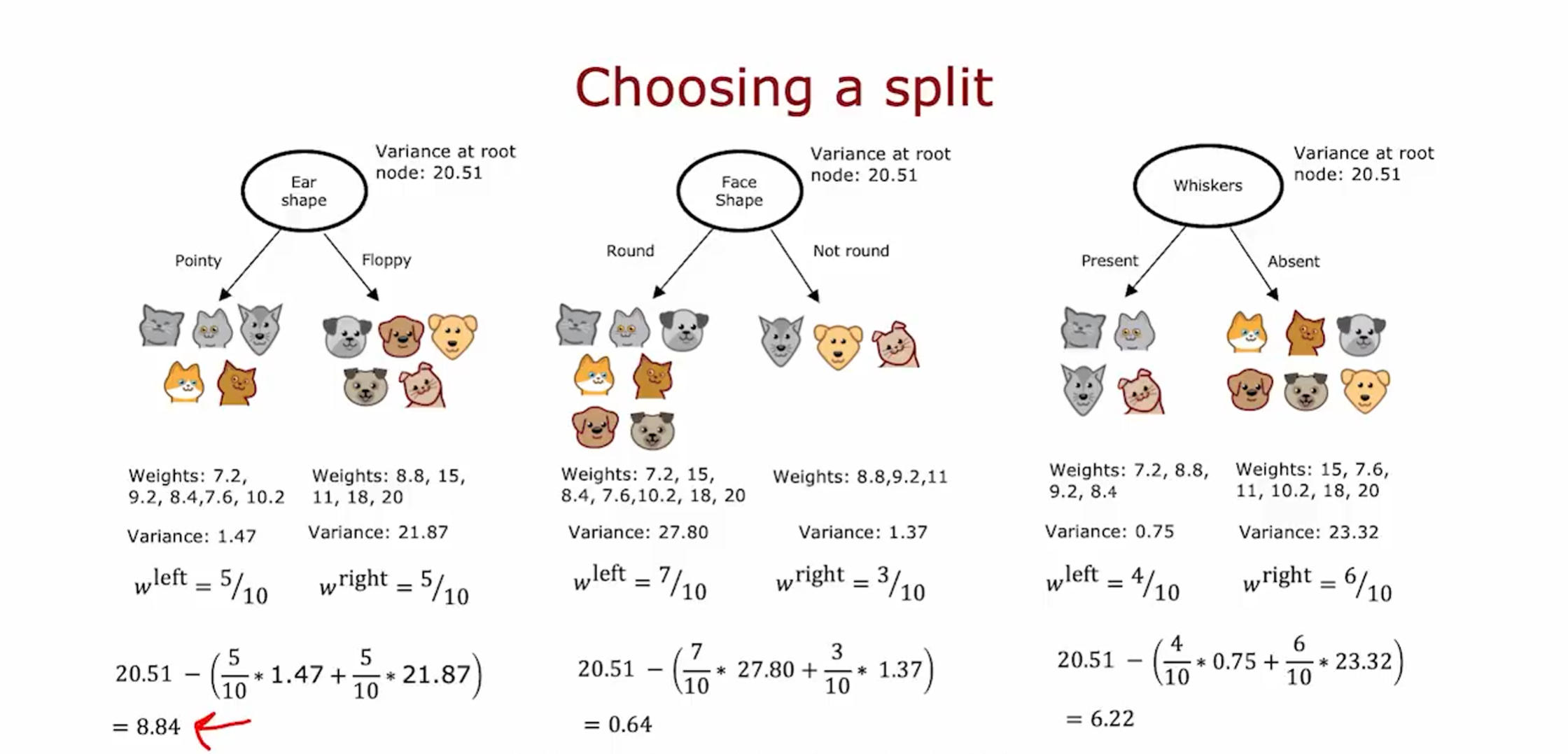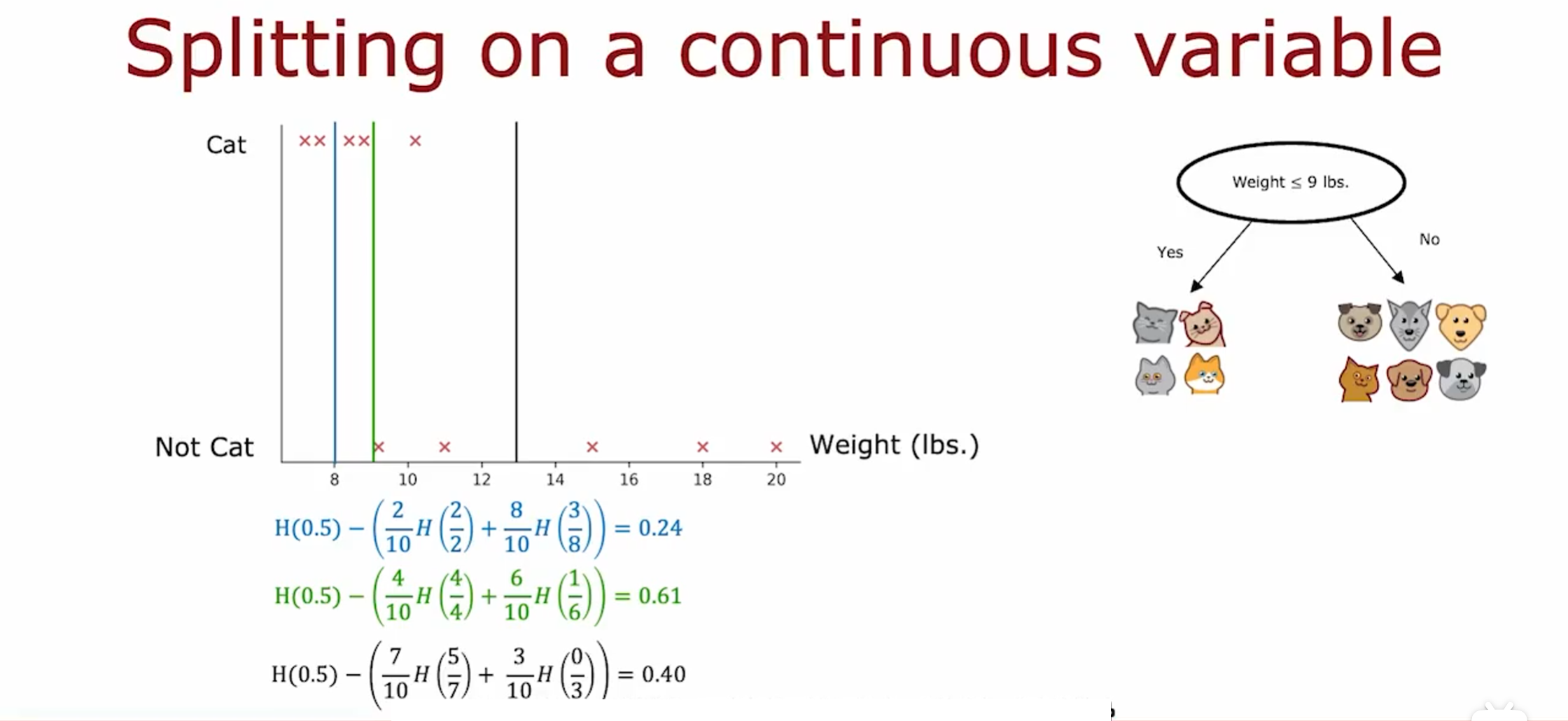 当选择9时,信息增益最大,因此我们用是否大于9磅进行分支。