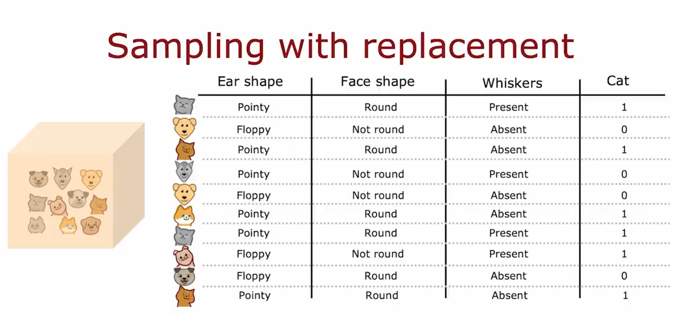 共十个样本,五个猫 五个狗,有放回的抽取10次,组成一个新的训练集。