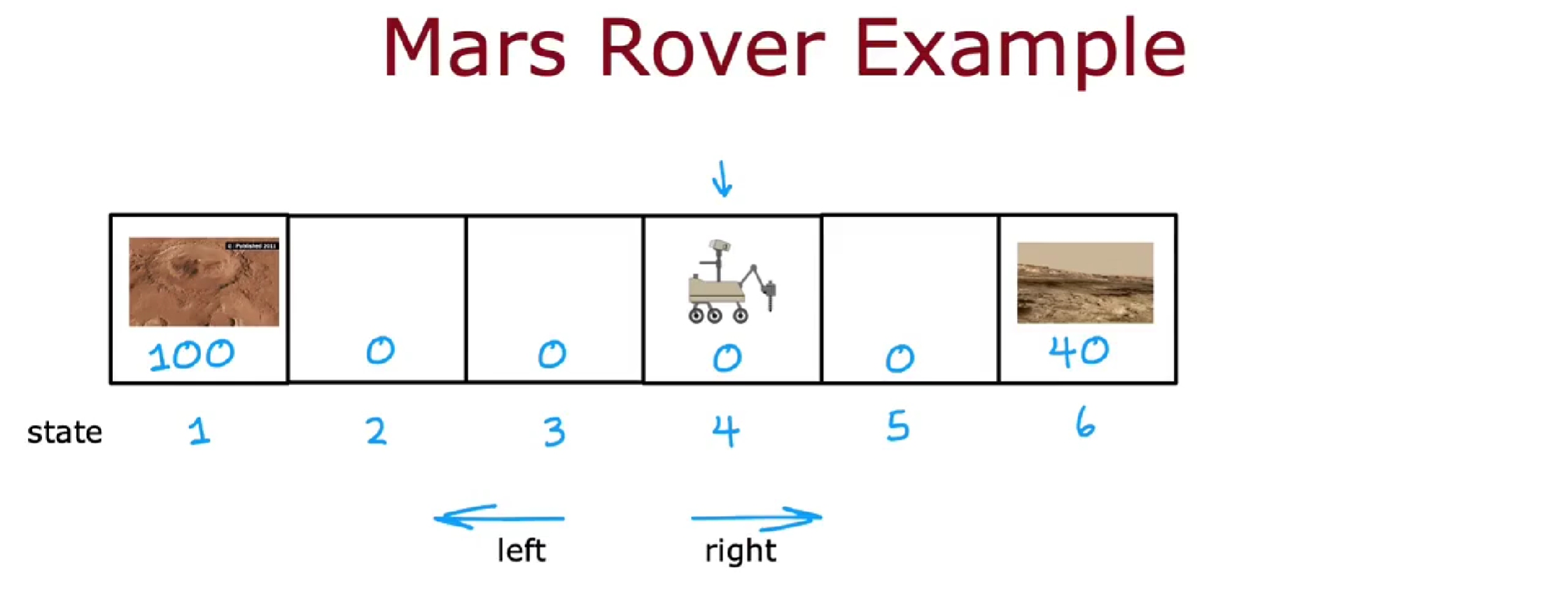 现在,位置1和位置6都有一些有趣的表面。科学家希望探测器对位置1进行采样,因为它比位置6更重要。但是位置1很远,所以我们通过奖励函数来反映状态的价值,在每个状态可以获得对应的奖励。状态1的奖励是100,状态6的奖励是40,其他状态的奖励都是0。在每一步中,探测器可以选择向左或向右移动。