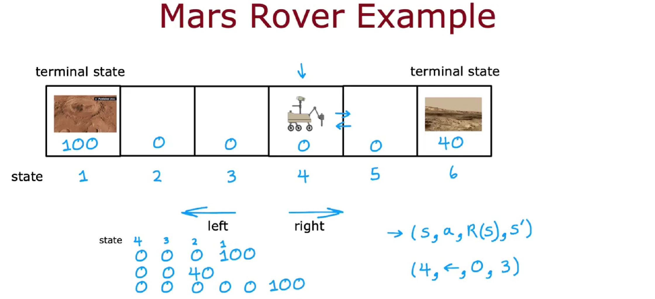 例如,当探测器处于状态4,并采取了向左走的动作,状态4奖励为0,变为新的状态3。
