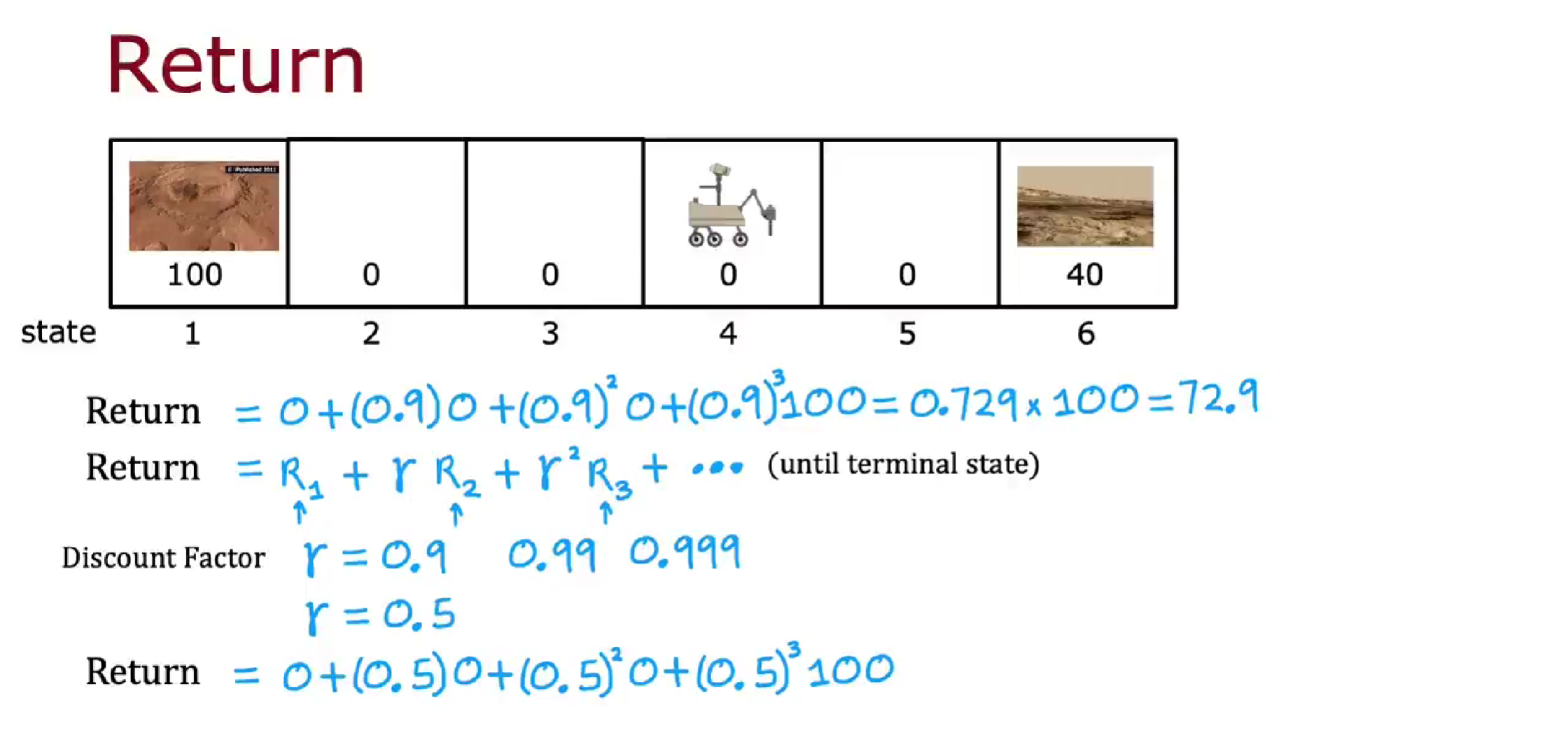 探测器在不同的位置可以走不同的路线,起点为位置4可以走4-3-2-1,也可以走4-5-6。较远的位置虽然奖励多,但是它所花费的时间和路程值得这些奖励吗?怎么知道一组特定的奖励比另一组不同的奖励更好还是更差?