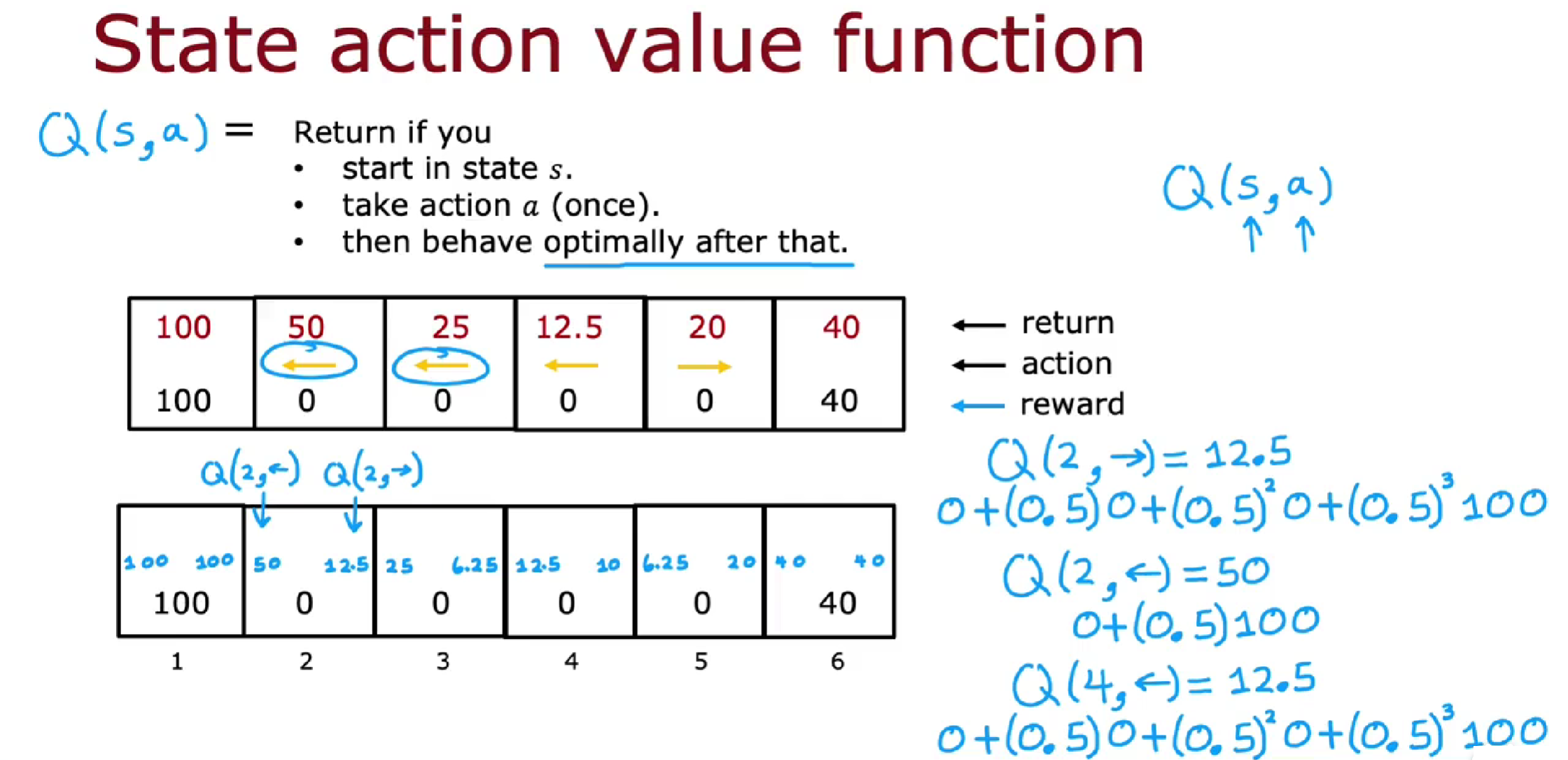 计算Q(2,→),则为以状态2开始,采取向右的行动,到状态3,那后面最优策略是一直向左走,行动轨迹为2-3-2-1,所以计算Q为12.5。
