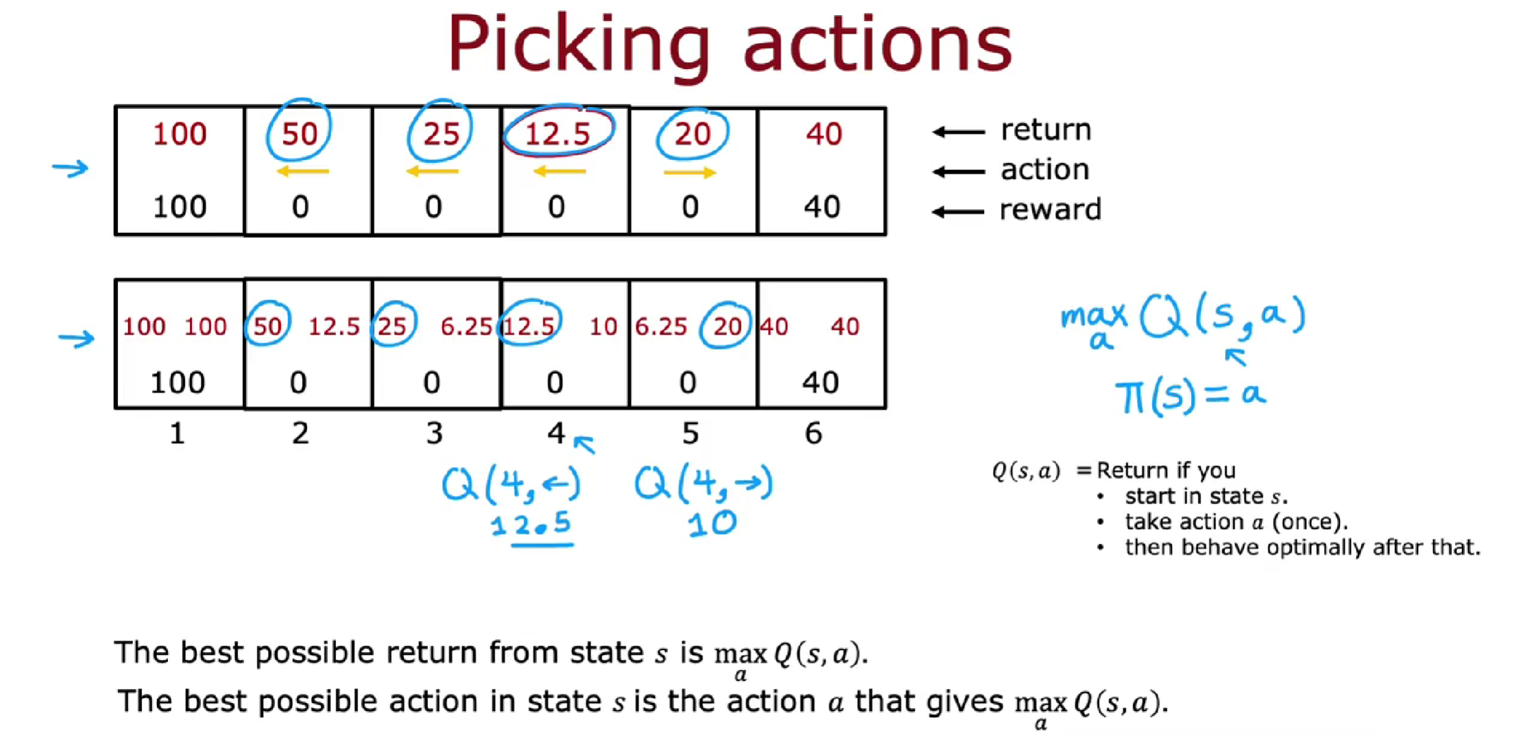 如果你可以计算每一个状态每一个动作的Q(s,a),然后找出最大的Q(s,a),这个Q(s,a)中的a即为最佳的行动,所以该状态s的 $\pi(s)=a$ 。