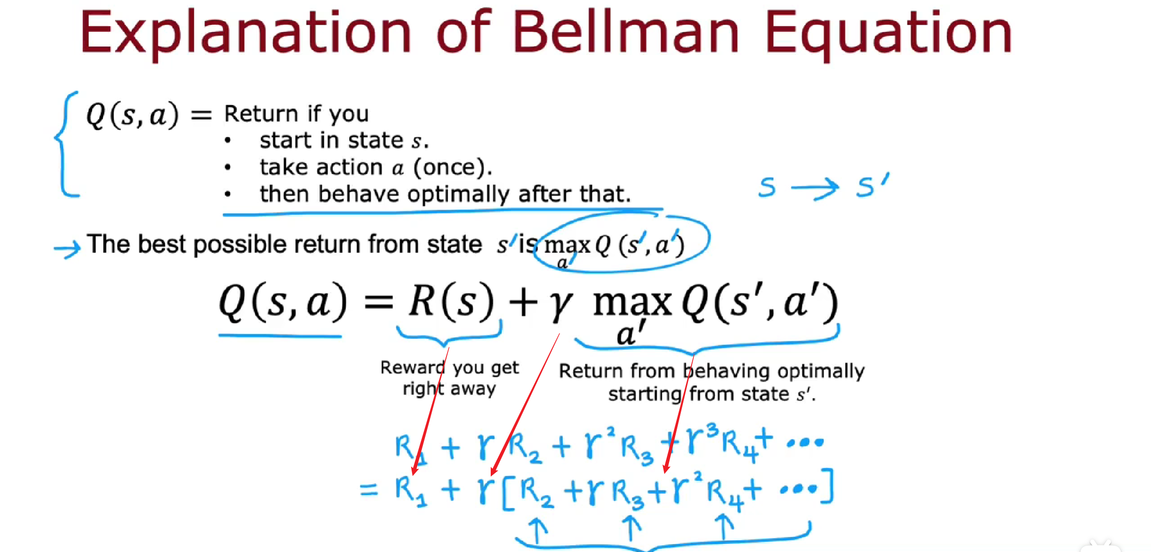 这是贝尔曼方程:$Q(s,a)=R(s)+\gamma\max_{a^{\prime}}Q(s^{\prime},a^{\prime})$ 。