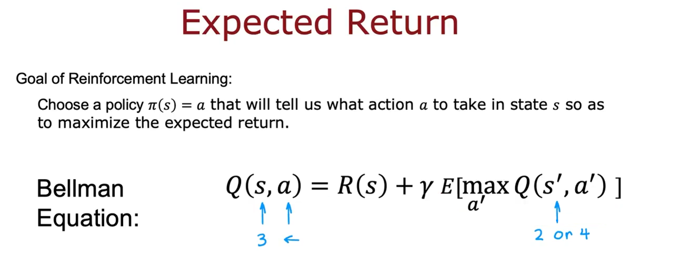 $$\begin{aligned}\text{Expected Return}&=\text{Average}(R_1+\gamma R_2+\gamma^2R_3+\gamma^3R_4+\cdots)\&=\text{E}[R_1+\gamma R_2+\gamma^2R_3+\gamma^3R_4+\cdots]\end{aligned}$$