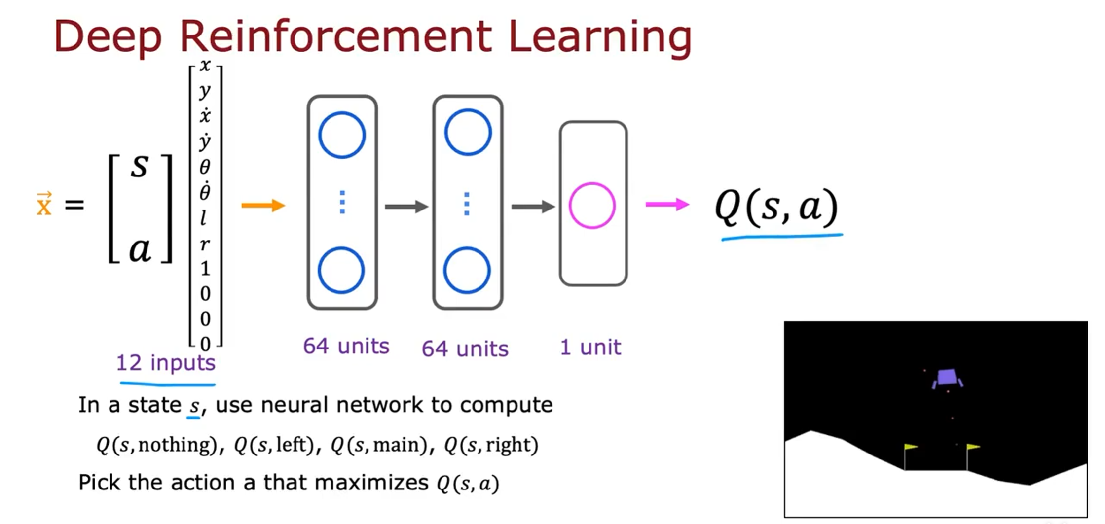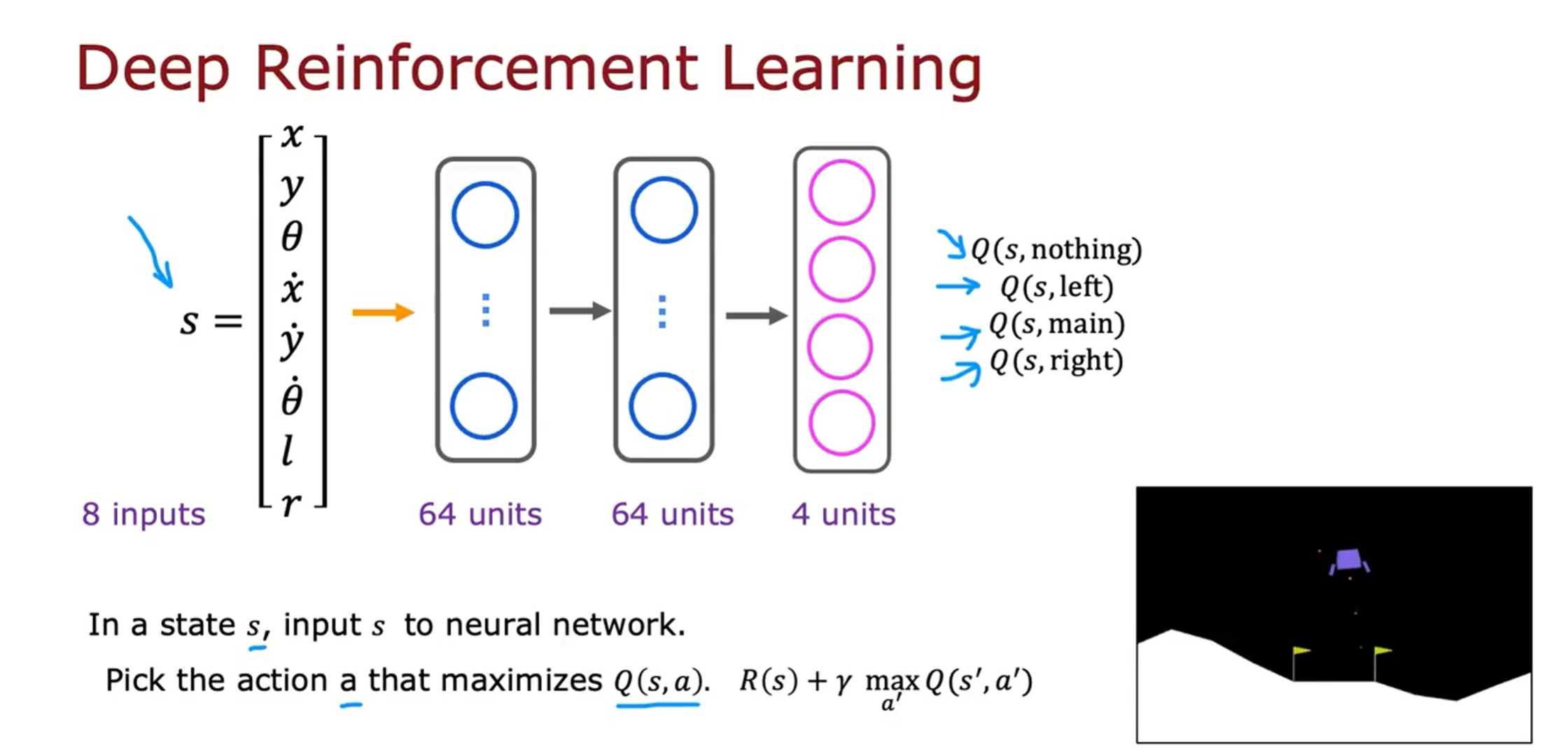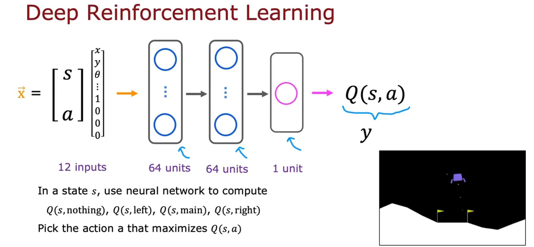 如果您可以在隐藏层和上层中选择适当的参数来训练神经网络,以便为您提供对Q的良好估计,那么每当您在月球着陆器处于某种状态s时,您就可以使用神经网络计算Q。对于所有四个动作,都可以计算Q,Q(s,nothing),Q(s,left),Q(s,main),Q(s,right),最后,哪个具有最高值,就选择那个相应的动作。