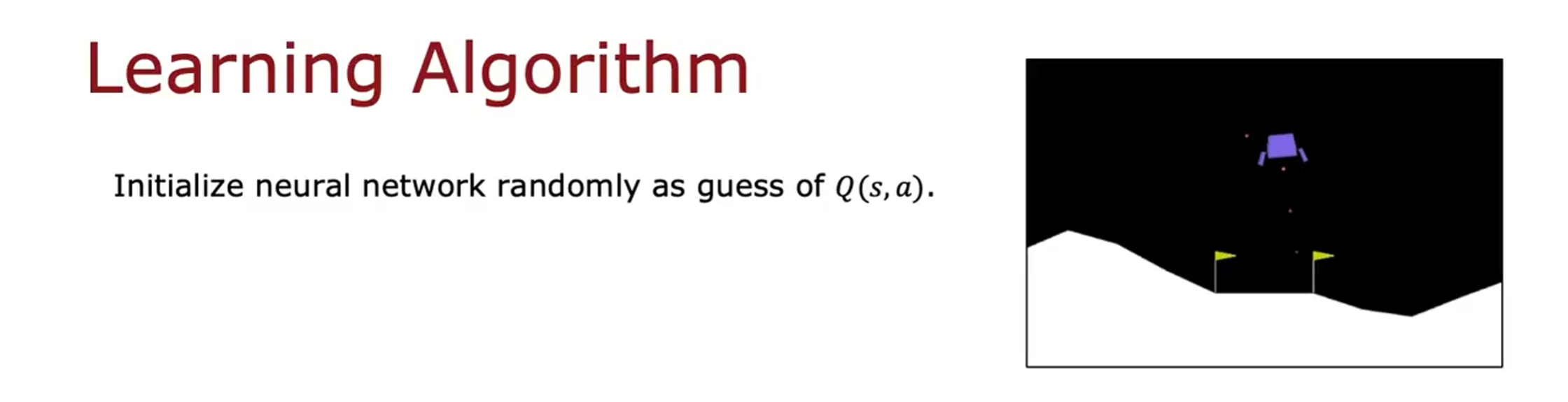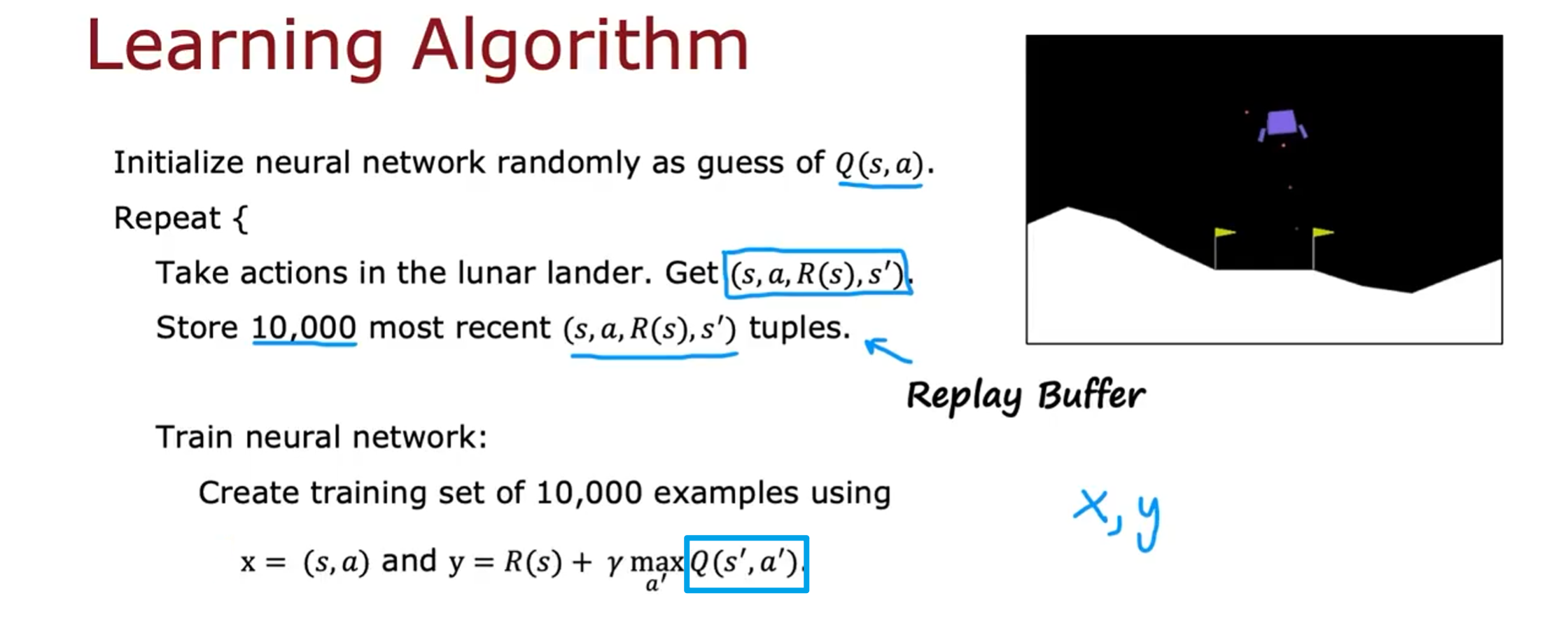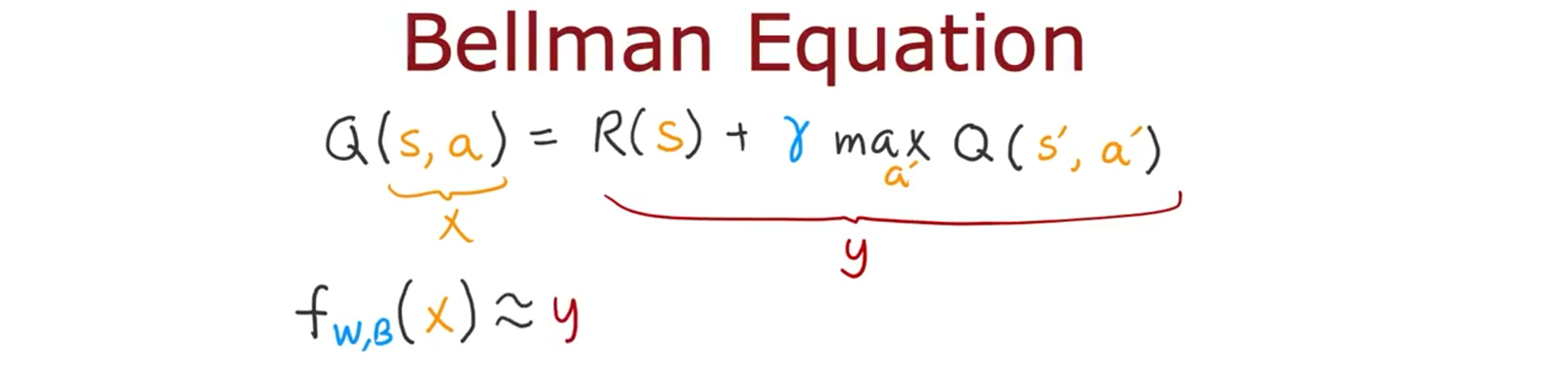 方法是使用贝尔曼方程来创建包含大量示例×和y的训练集,然后我们使用监督学习,就像神经网络时所学的一样。使用监督学习,利用神经网络学习从x到y的映射,即从状态动作对到目标值Q的映射。