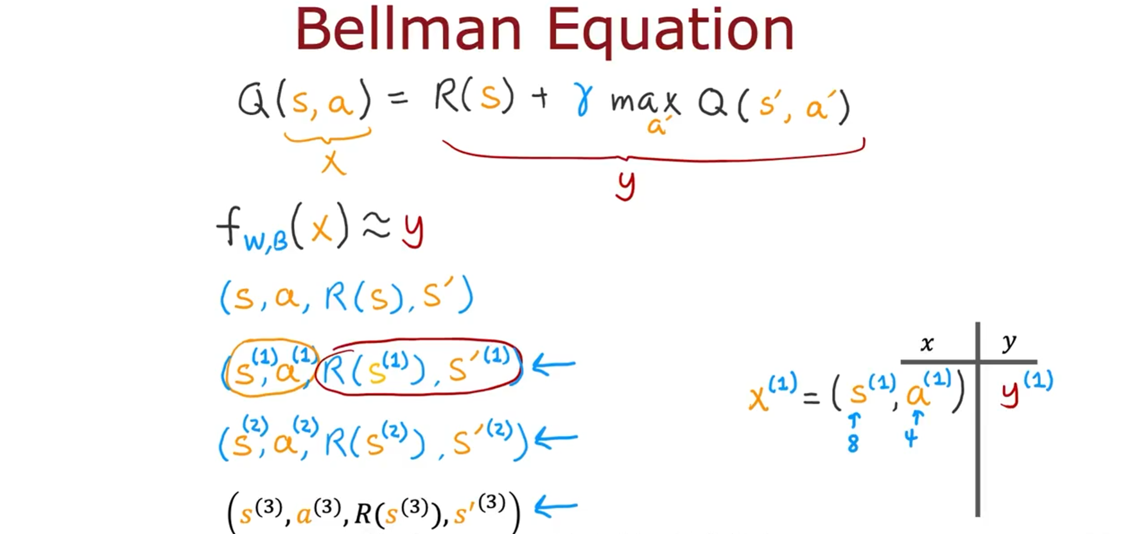 例如,$x^1$ 就是 $x^{(1)}=(s^{(1)},a^{(1)})$ ;$y^1$ 将使用贝尔曼方程的右侧计算。
