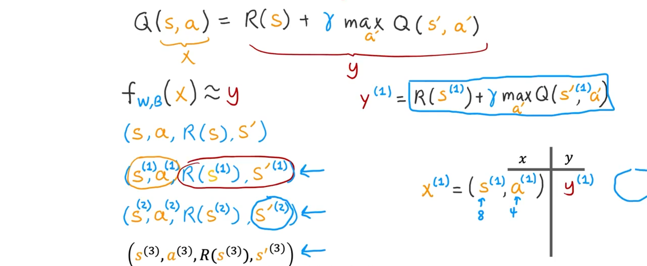 贝尔曼方程表示,当您输入 $s^{(1)},a^{(1)}$ 时,希望 $Q(s^{(1)},a^{(1)})=R(s^{(1)})+\gamma\max_{a^{\prime}}Q(s^{\prime(1)},a^{\prime})$ 。$y^1$ 即等于 $R(s^{(1)})+\gamma\max_{a^{\prime}}Q(s^{\prime(1)},a^{\prime})$ 。注意,元组最后的两个元素提供了足够的信息来计算右侧,计算后这将是数字,比如12.5或17。 我们将数字保存为 $y^1$ 。这对 $x^1,y^1$ 成为了第一个训练示例。