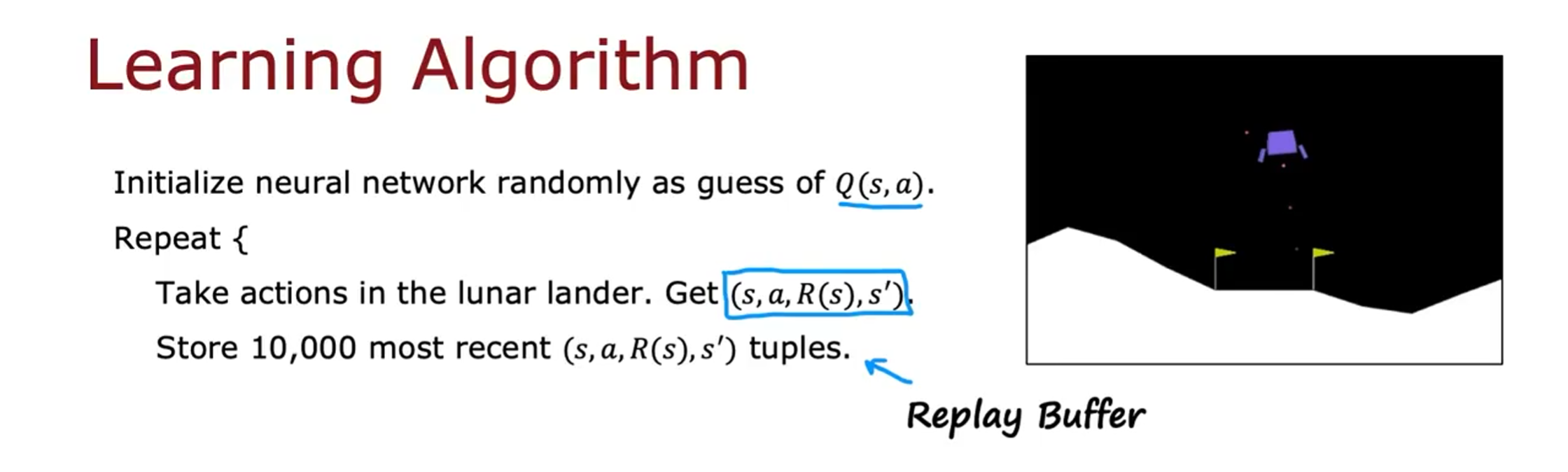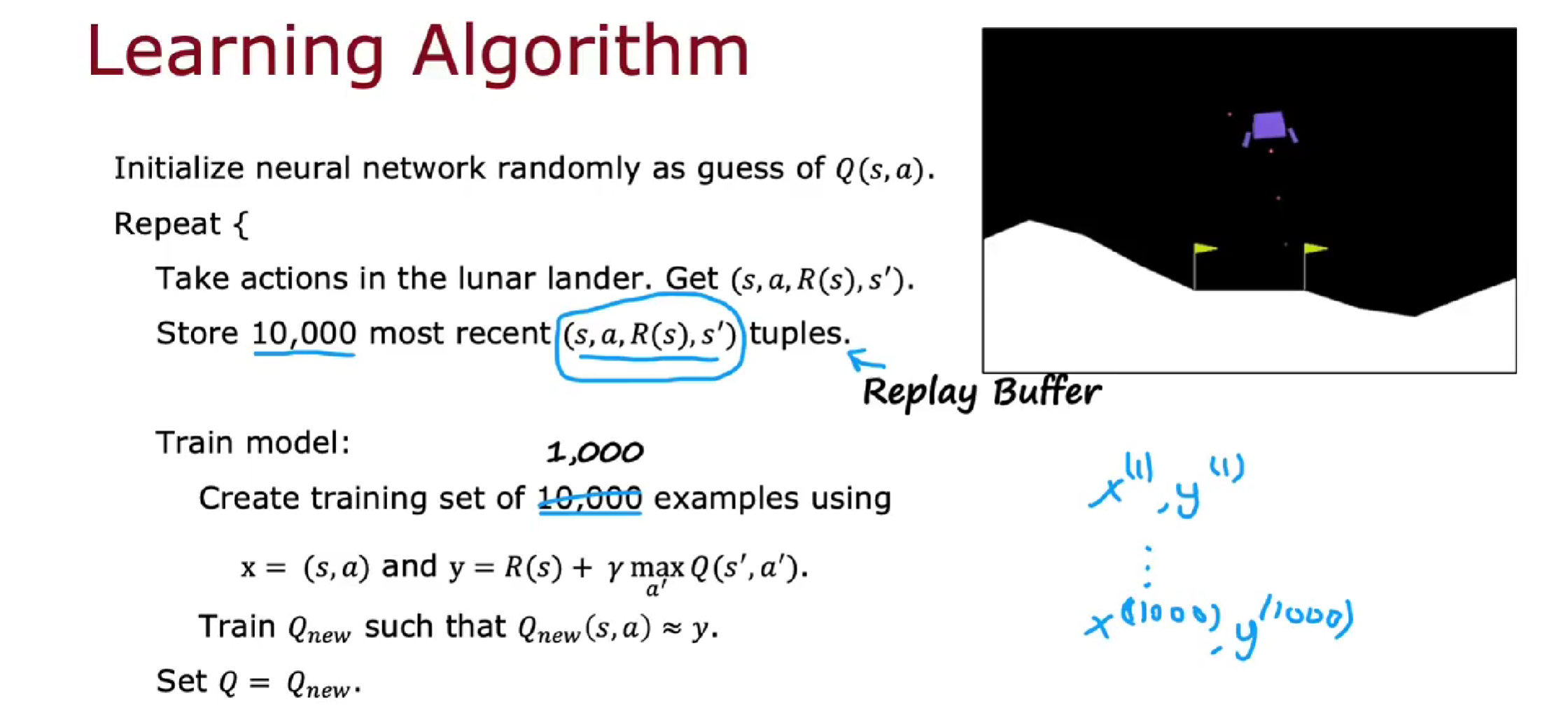接下来,我们将重复执行以下操作;我们将对着陆器中采取动作,然后得到众多元组 $(s,a,R(s),s^{\prime})$ , 我们要做的是存储这些元组的10,000个最新示例。当你运行这个算法时,你会看到着陆器有很多步骤,可能有几十万个步骤。为了确保我们最终不会使用过多的计算机内存,通常的做法是只记住我们在 MDP中看到的10,000个最近的此类元组。这种仅存储最近示例的技术在强化学习算法中称为回放缓冲区。