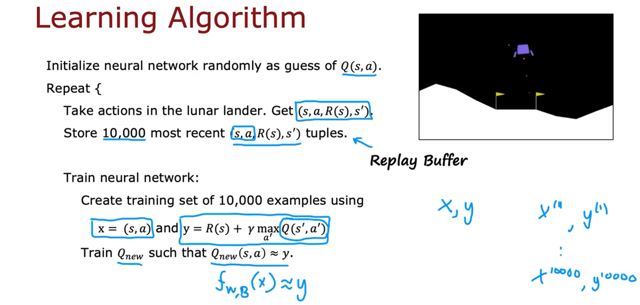 创建这10,000个训练示例后,我们将拥有训练示例 $x^1$ 、$y^1$ 到 $x^{10,000}$ 、$y^{10,000}$ 。我们将训练一个神经网络,我将把新的神经网络称为Qnew,这样 $Q_{new}(s,a)\approx y$ 。这正是训练那个神经网络 $f_{W,B}(x)\approx y$ 。现在,这个神经网络应该稍微更好地估计Q函数是什么,接着我们要做的是将Q设置为我们刚刚学习的新神经网络