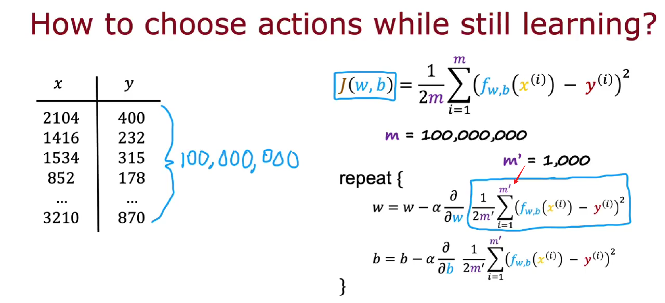 当样本数量非常大时,例如有一亿个样本,如果梯度下降的每一步都需用全部样本计算平均值,那么算法会运行的很慢。使用小批量是每次梯度下降时,只关注一个batch的数据。使用小批量梯度下降的思想是不用再每次迭代中使用1亿个示例,而是选择一个较小的数,如1000,这将花费较少的时间。