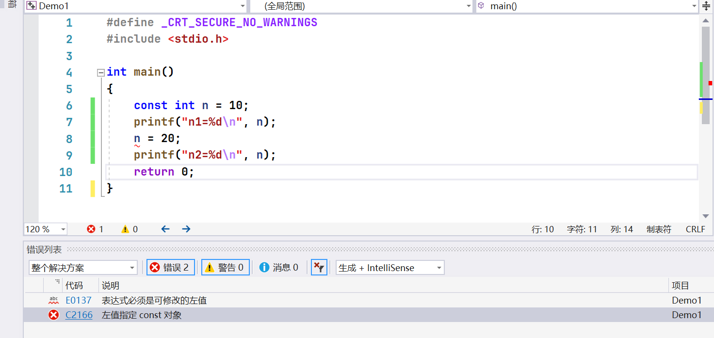 变量 n 的值是可以后续赋值改变的,但用const定义之后,编译器不允许修改其值,其值不可再改变,如果再次被赋值就会被报错。