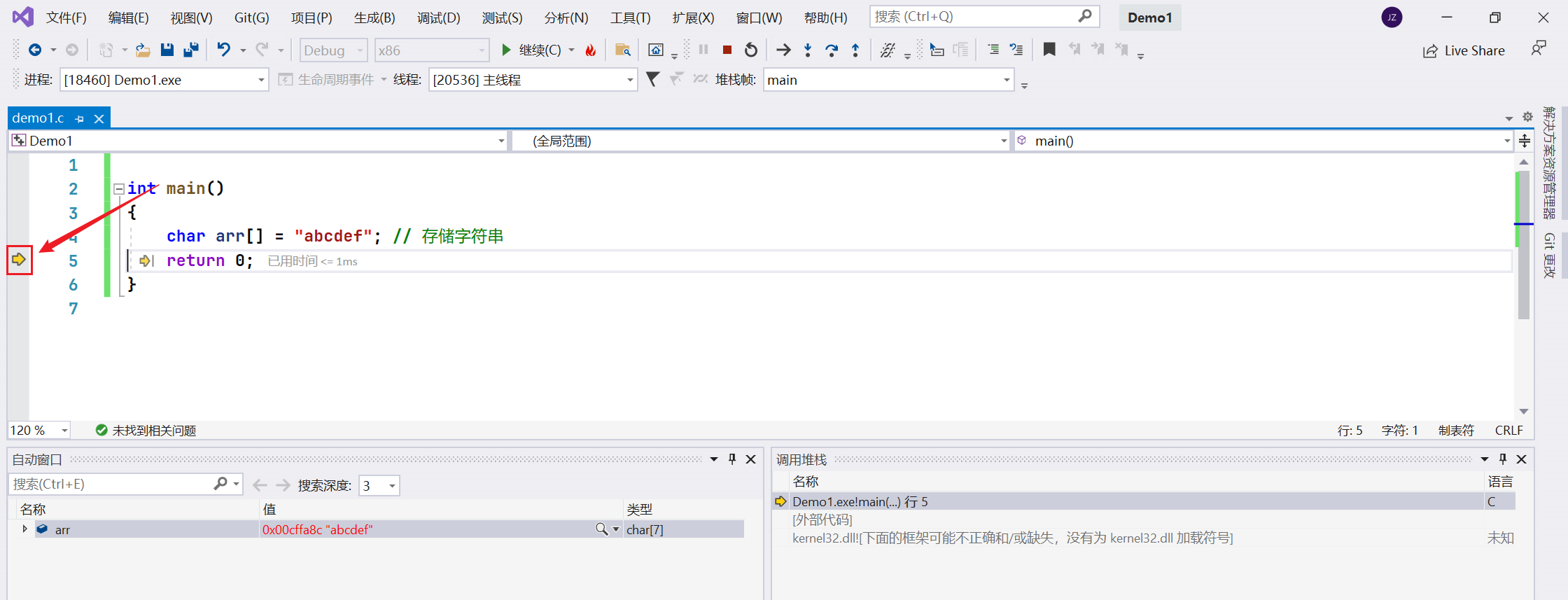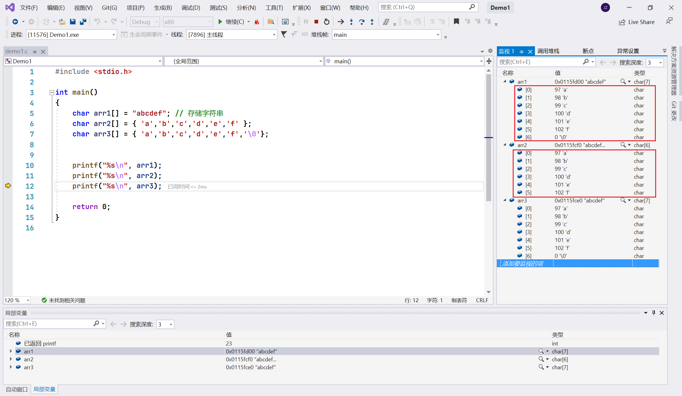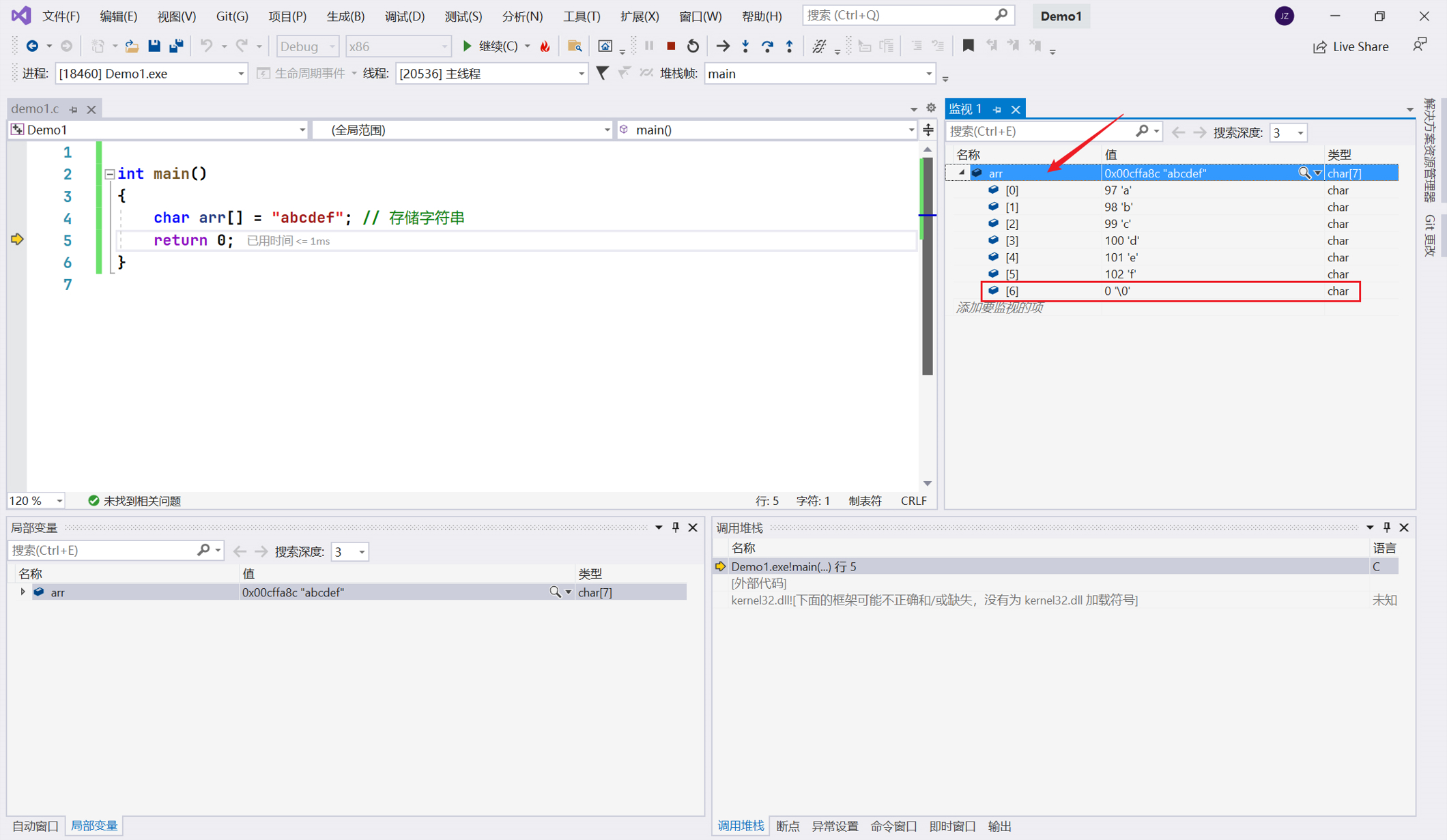 我们发现数组arr大小为7并不是6,除了所要存储的 abcdef 外还另外放入了 \0 ,说明还默认存储了一个 \0 ,这个 \0 即为字符串的结束标志。