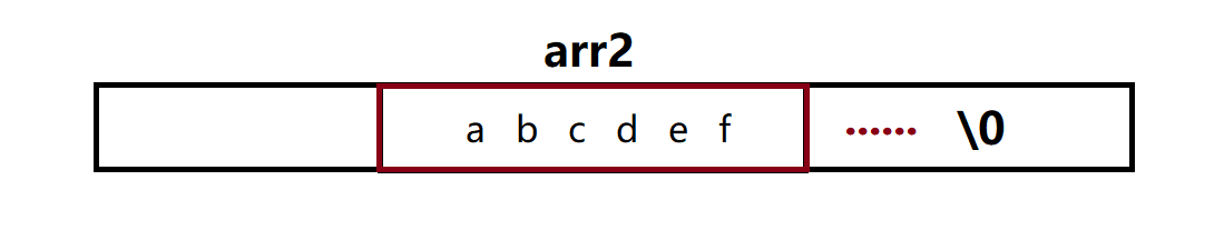 数组arr2也是从 a 开始打印,但是不同的是 arr2 中并没有 \0 ,而且arr2后面还有内存,内存中存储了其他内容,所以程序继续往后打印,直到遇到了一个 \0 结束打印,这就是为什么arr2会打印我们指定外的内容。