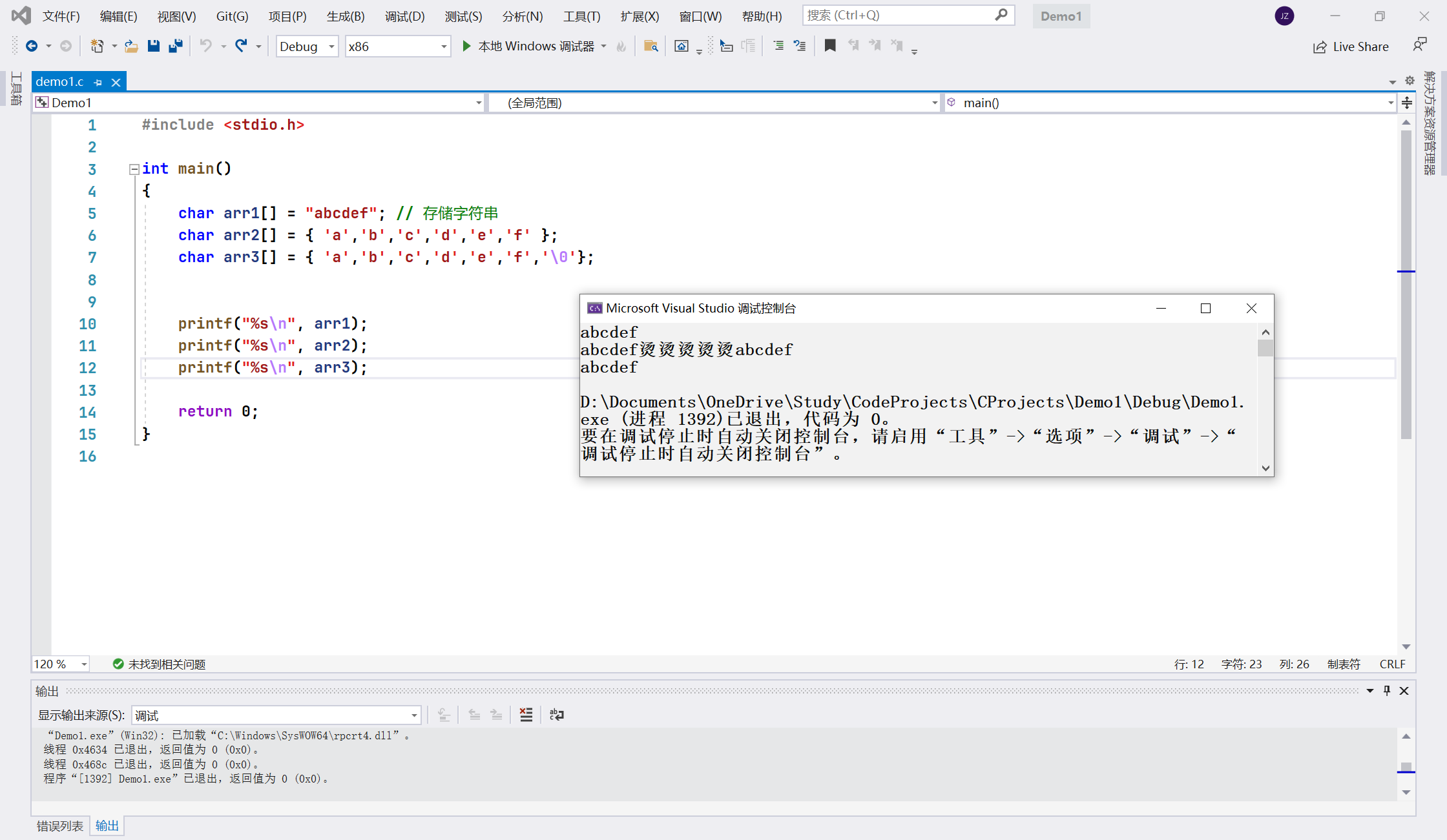 arr1用字符串初始化,编译系统会自动加入 \0 ,所以arr1中有 \0 ; 当我们主动给arr2中放入 abcdef ,数组中并没有 \0 。