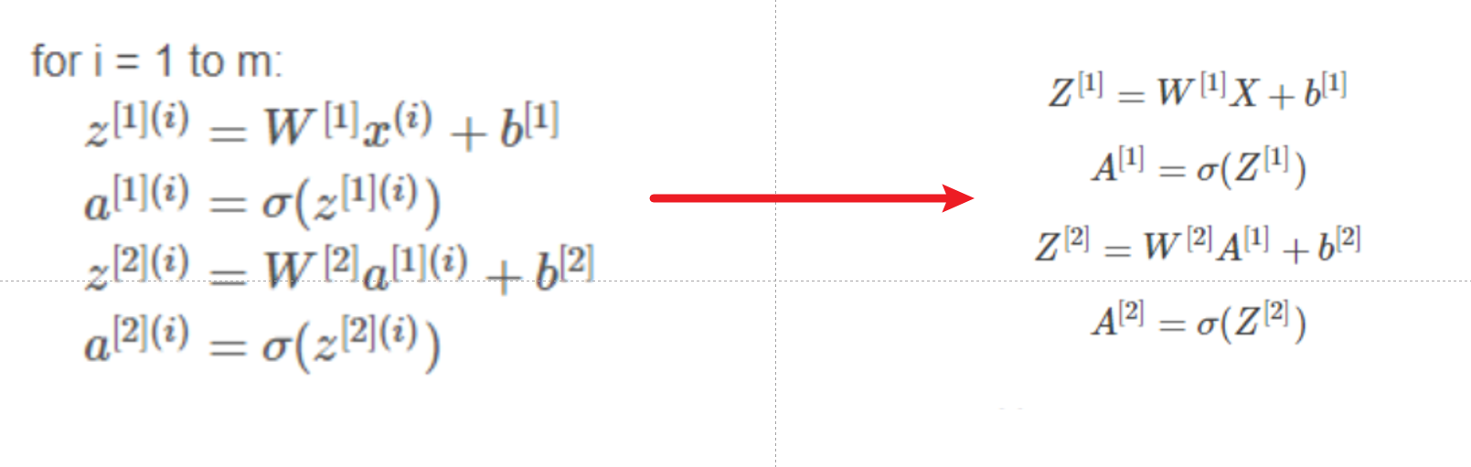 对于m个训练样本的运算,不使用for循环,利用矩阵运算的思想,输入矩阵X的维度为($n_x$,m)。这样,我们可以将for循环写成矩阵运算的形式: