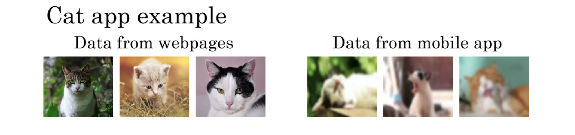 我们以猫类识别为例,训练集来自网络下载的图片,比较清晰,而验证/测试集来自用户手机拍摄的图片,比较模糊。