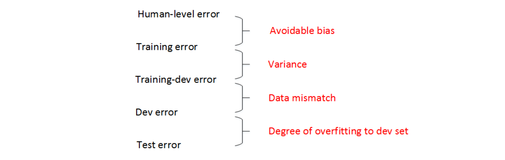 通过引入训练-验证集,我们有了训练误差、训练-验证误差和验证误差三种误差。其中,训练误差与训练-验证误差的差值反映了variance(方差)问题;训练-验证误差与验证误差的差值反映了数据不匹配问题,即样本分布不一致的问题。